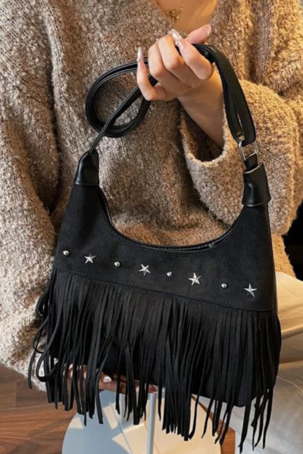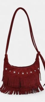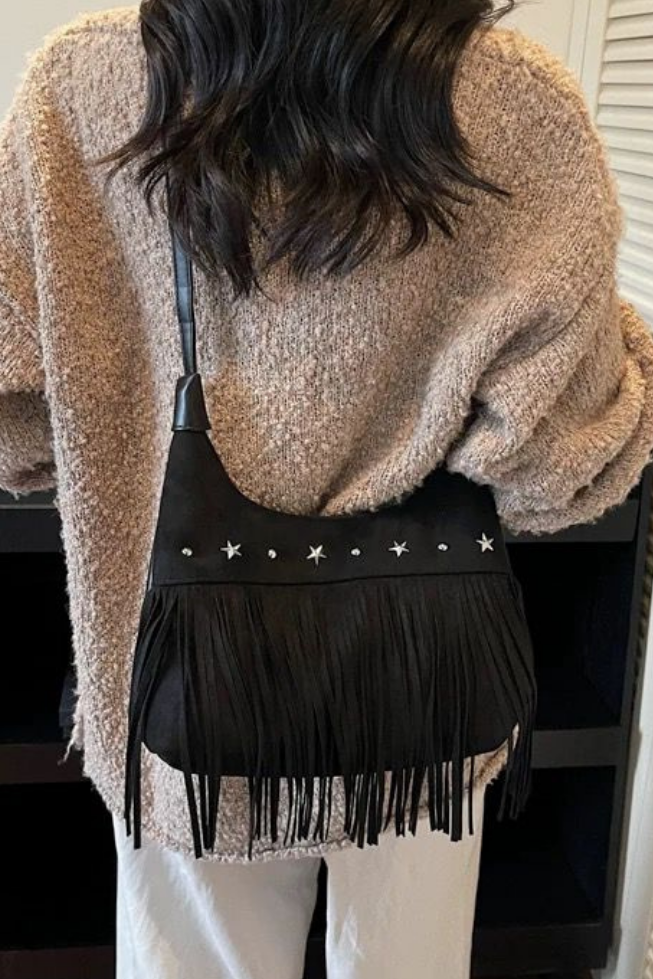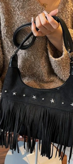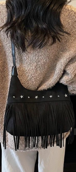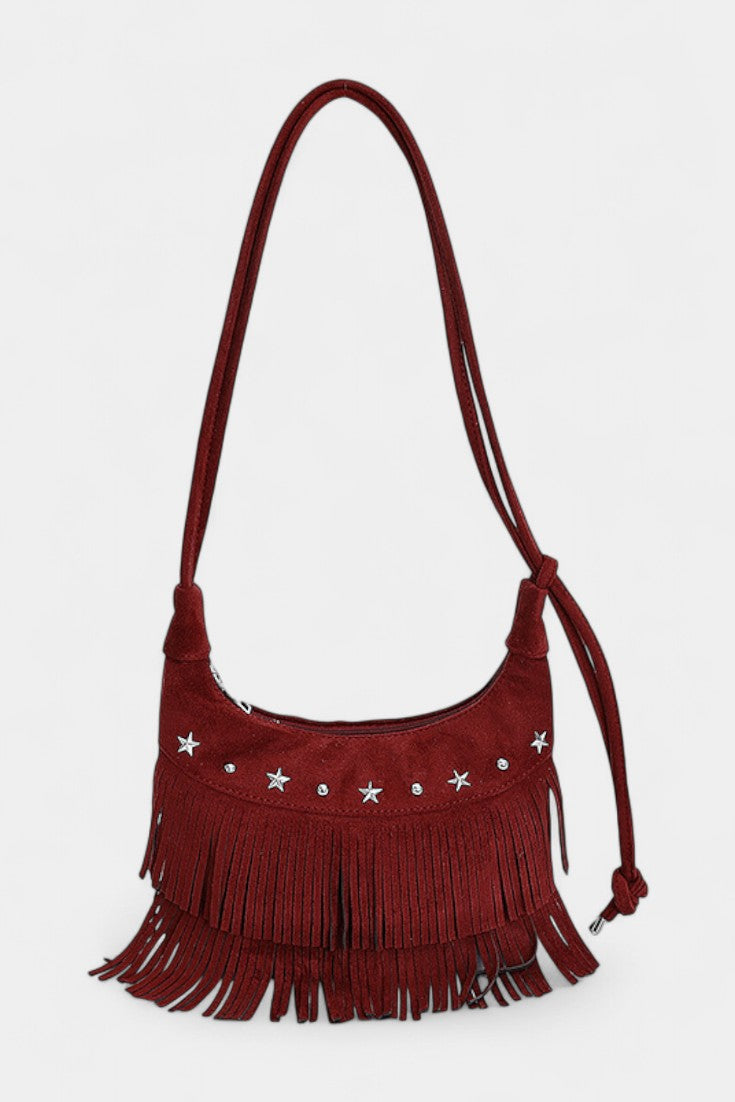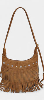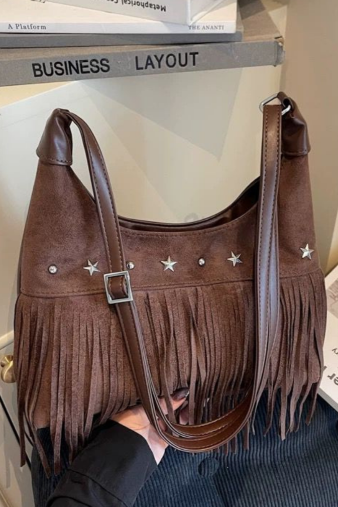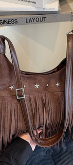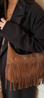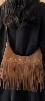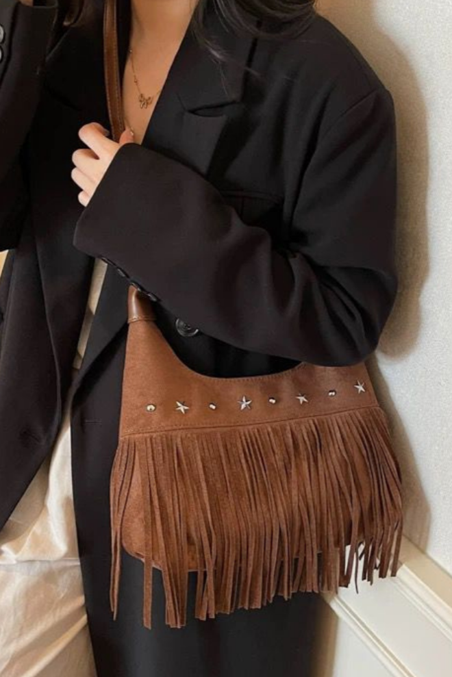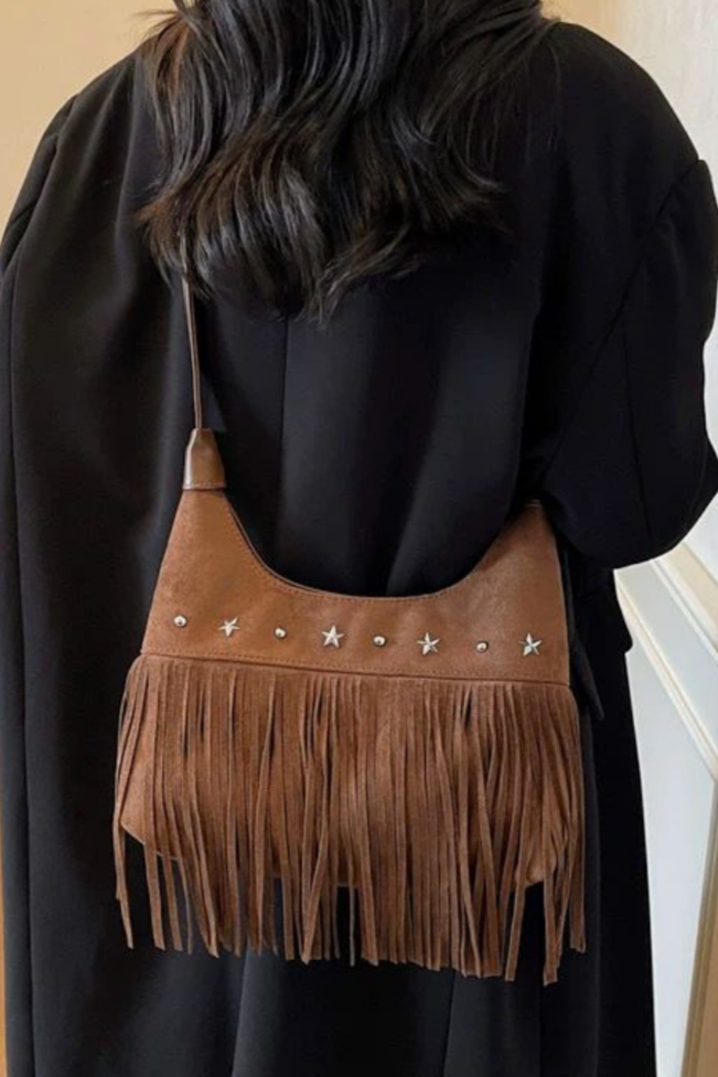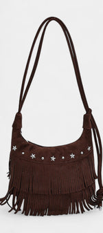 Avec un air libre et décontracté, il apporte une touche bohème chic à n'importe quel look. Confectionné en daim marron et décoré de longues franges et d'appliques métalliques en forme d'étoiles, c'est la pièce parfaite pour ceux qui recherchent un style polyvalent avec caractère et personnalité.
