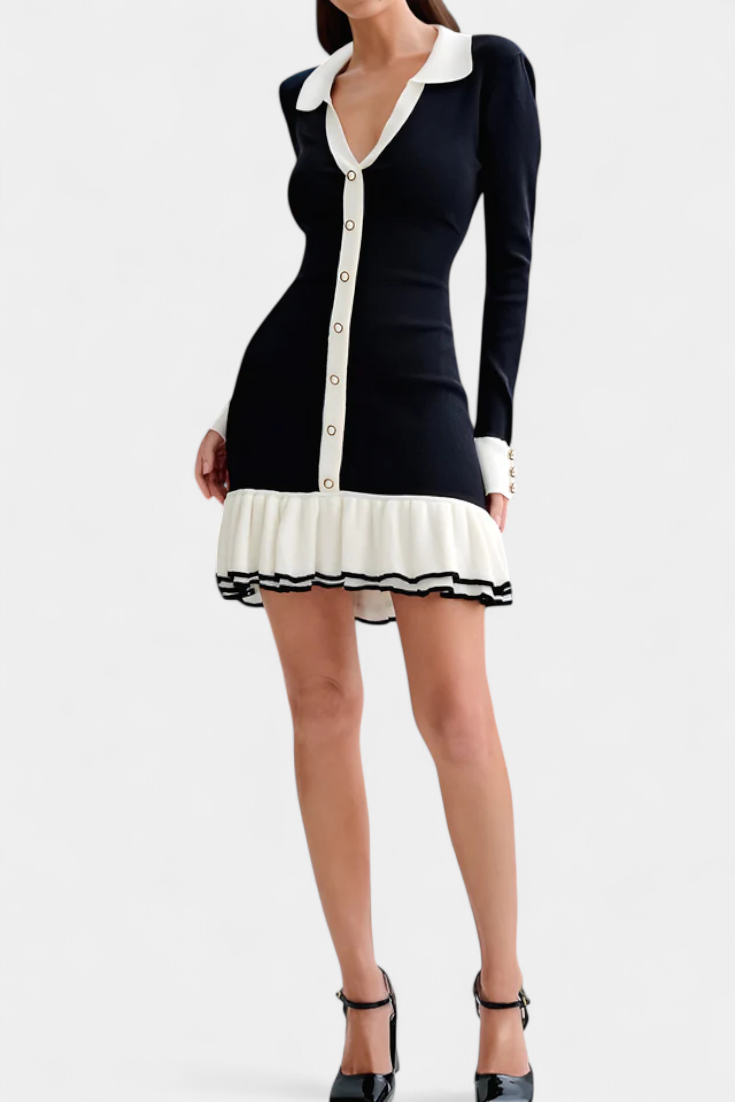 Églantina Robe Pull Mini Près du Corps à Col Montant et Volants