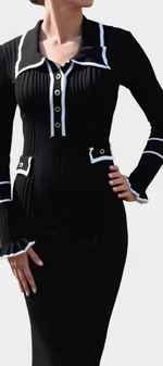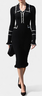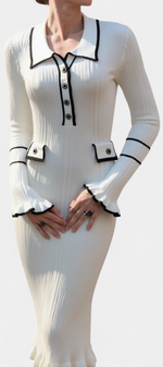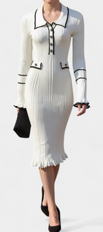Inspirée par l'élégance classique de Chanel, la robe Jamila allie sophistication et charme moderne. Confectionnée en doux tricot acrylique, elle présente un design aux couleurs contrastantes qui met en valeur sa silhouette structurée. Le col polo et les manches évasées apportent une touche raffinée, tandis que la taille haute et les délicats volants ajoutent féminité et mouvement.