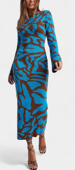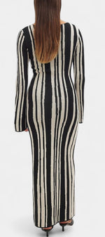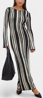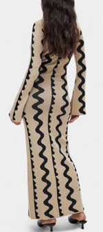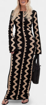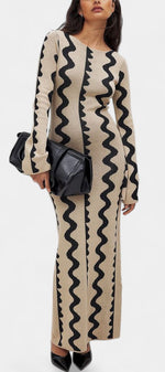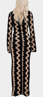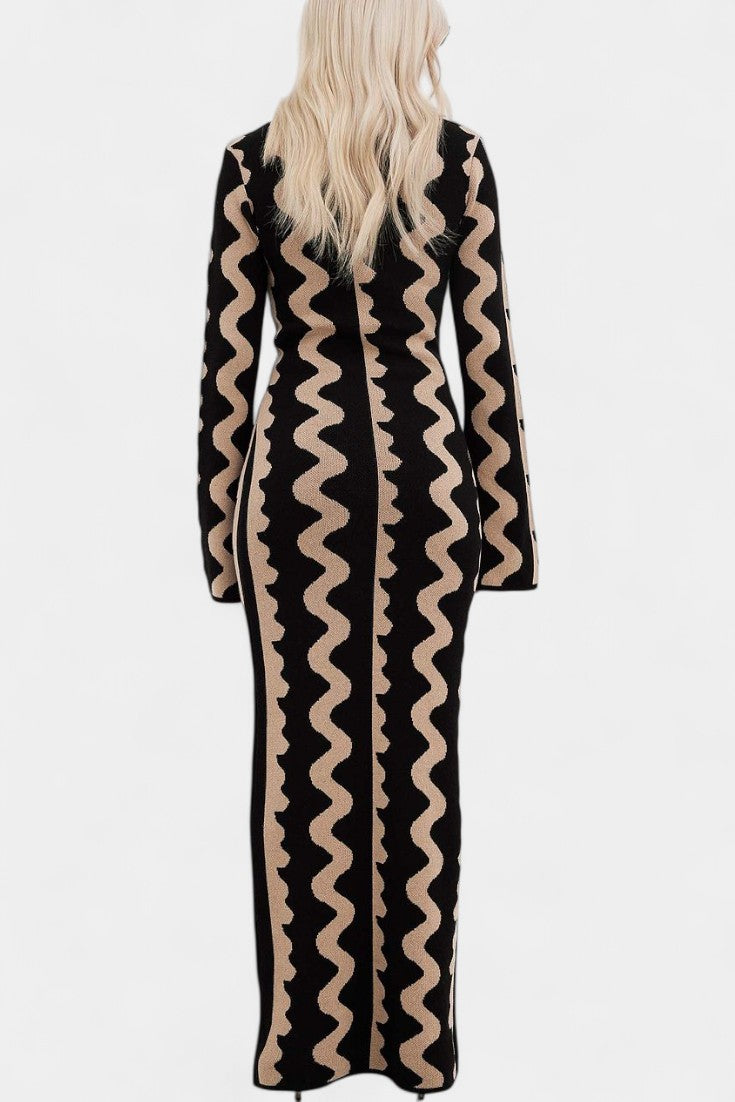 Moderne et architectural, la robe Maphie redéfinit l'élégance en tricot avec un motif graphique de lignes ondulées qui stylisent la silhouette. Sa coupe ajustée avec manches longues apporte une allure raffinée et contemporaine, idéale pour se démarquer lors d'occasions tant de jour que de nuit.