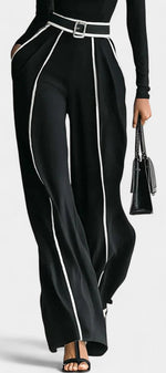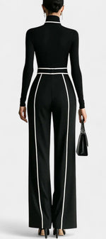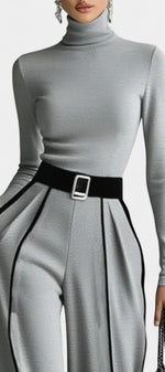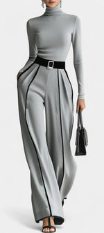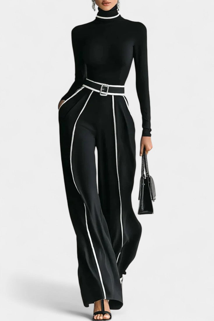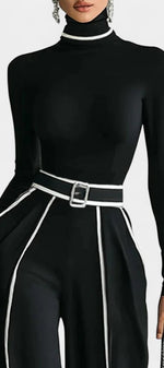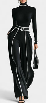 Kirralee incarne l’élégance contemporaine avec une touche graphique maîtrisée. Son haut à col montant, rehaussé de bordures blanches contrastantes, s’associe à un pantalon à jambes larges pour une silhouette fluide et allongée. La ceinture assortie structure la taille, apportant équilibre et sophistication à cet ensemble aussi chic que confortable.