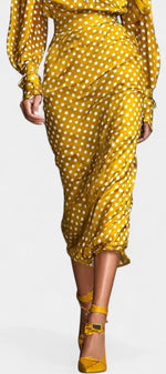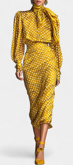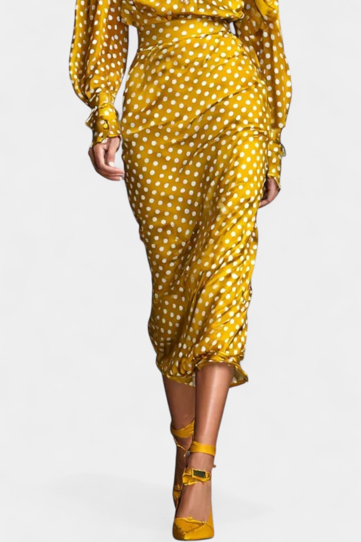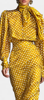 Seranya célèbre l’allure rétro avec une sophistication contemporaine. Composé d’une chemise en satin fluide et d’une jupe midi assortie, cet ensemble met en valeur un imprimé à pois emblématique revisité avec modernité. Le foulard coordonné ajoute une note chic et polyvalente, pour un look harmonieux qui respire le charme et l’élégance intemporelle.