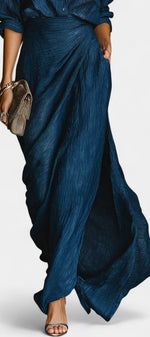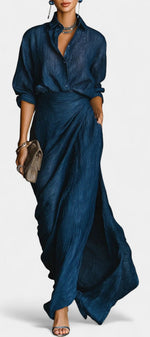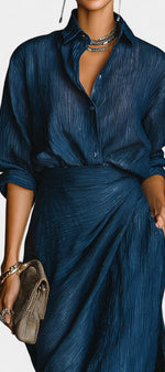 Ziya incarne une élégance décontractée sublimée par une teinte bleu foncé intemporelle. Sa chemise légère à manches longues s’associe harmonieusement à une jupe maxi fluide, créant une silhouette à la fois aérienne et raffinée. Confectionné dans un tissu respirant, cet ensemble allie confort, sophistication et polyvalence pour accompagner toutes les saisons avec style.