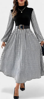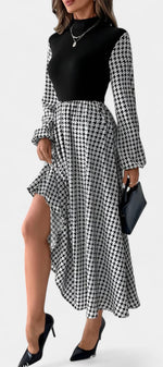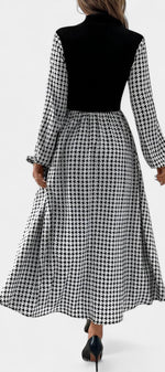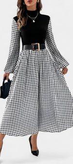 Lauriane marie le charme intemporel du motif pied-de-poule à une coupe moderne et flatteuse. Confectionnée dans un tissu doux et extensible, cette robe midi à col montant séduit par son style patchwork élégant et sa silhouette en A qui met en valeur la taille tout en offrant confort et mouvement. Un équilibre parfait entre classicisme et modernité.