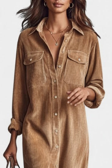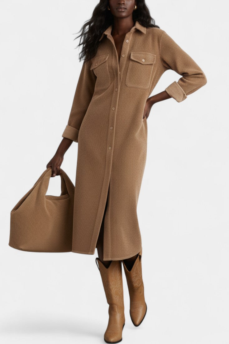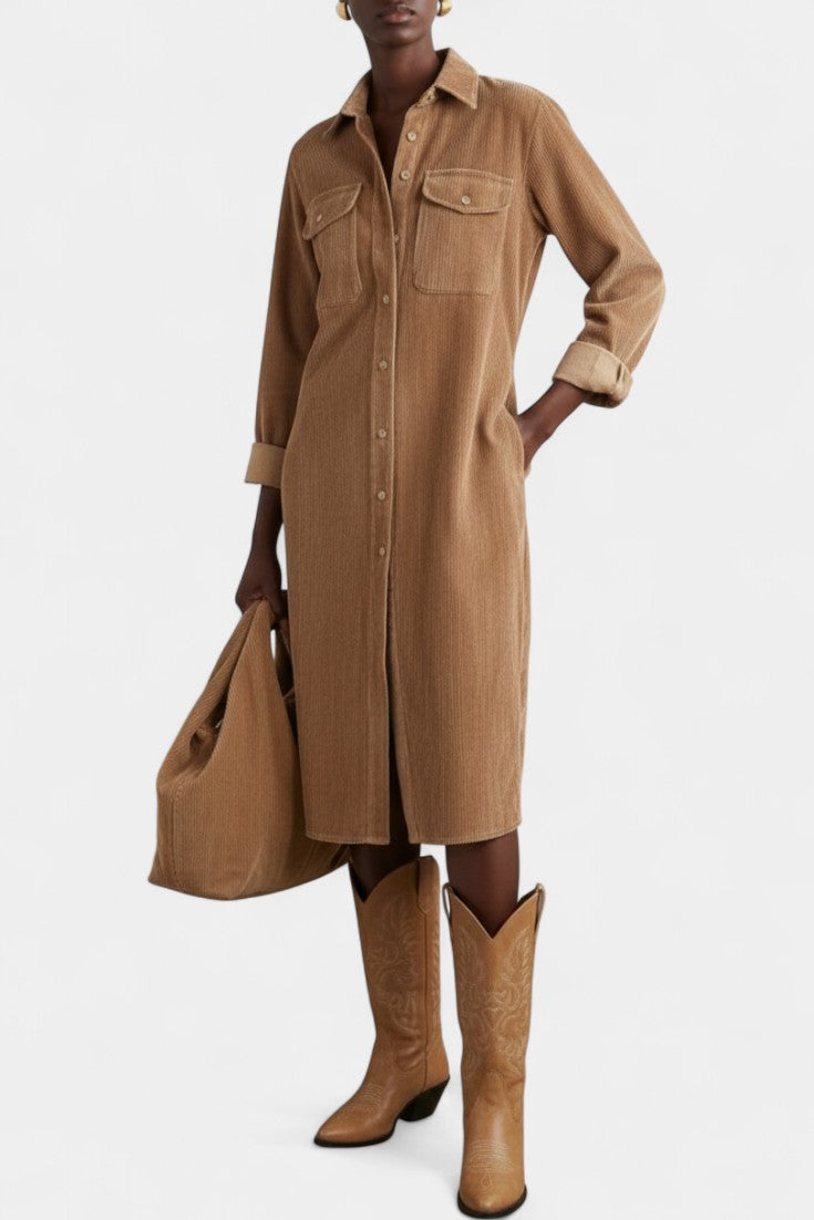 Zarza Robe Midi en Velours Côtelé avec Poches et Boutonnage Classique